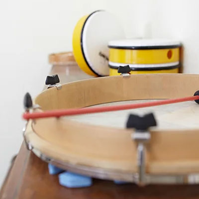 Rhythmusspiele, gemeinsames Singen und der Einsatz einfacher Instrumente fördern musikalisches Empfinden und sprachliche Entwicklung.