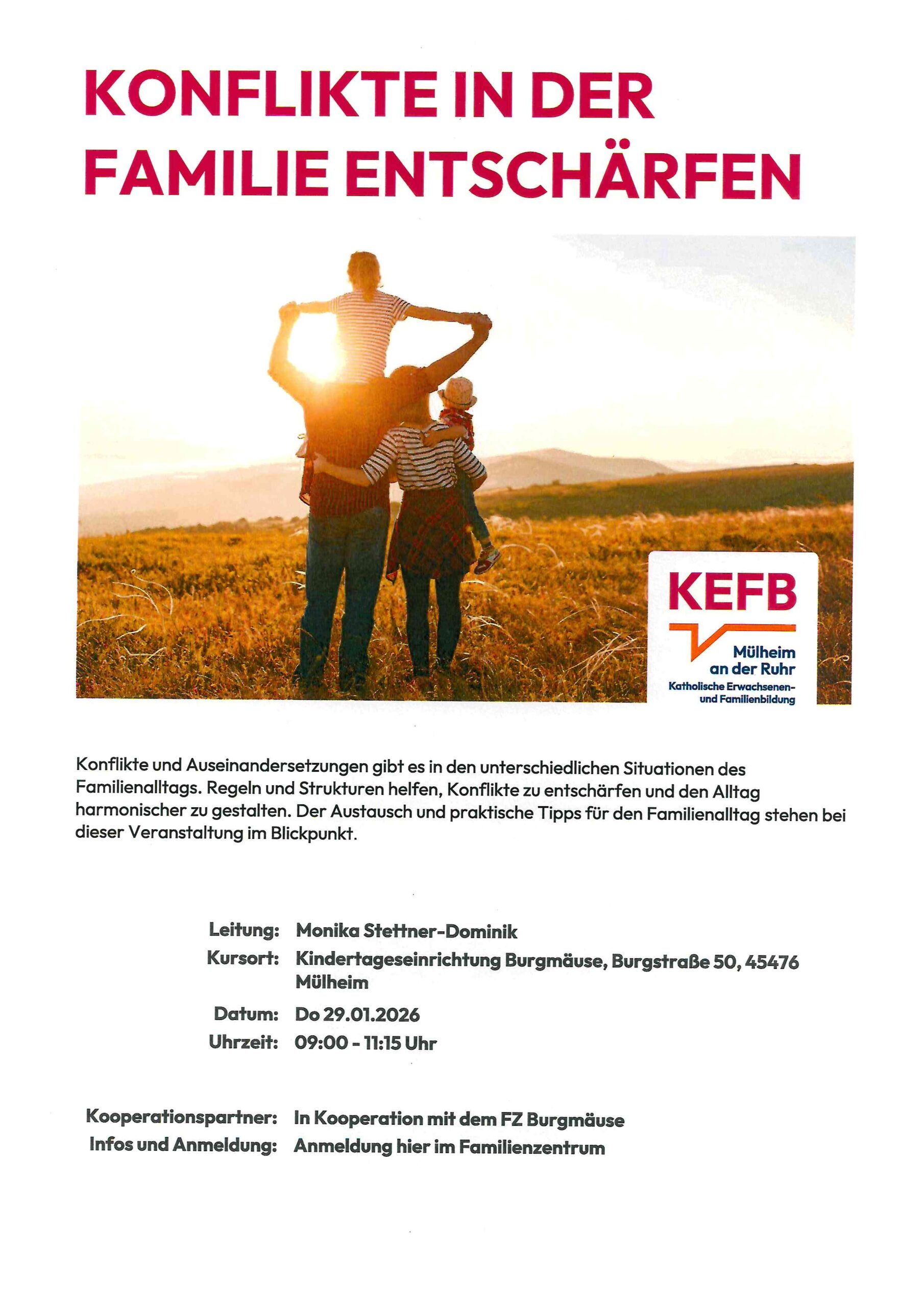 Konflikte und Auseinandersetzungen gibt es in den unterschiedlichen Situationen des Familienalltags. Regeln und Strukturen helfen, Konflikte zu entschärfen und den Alltag harmonischer zu gestalten. Der Austausch und praktische Tipps für den Familienalltag stehen bei dieser Veranstaltung im Blickpunkt.