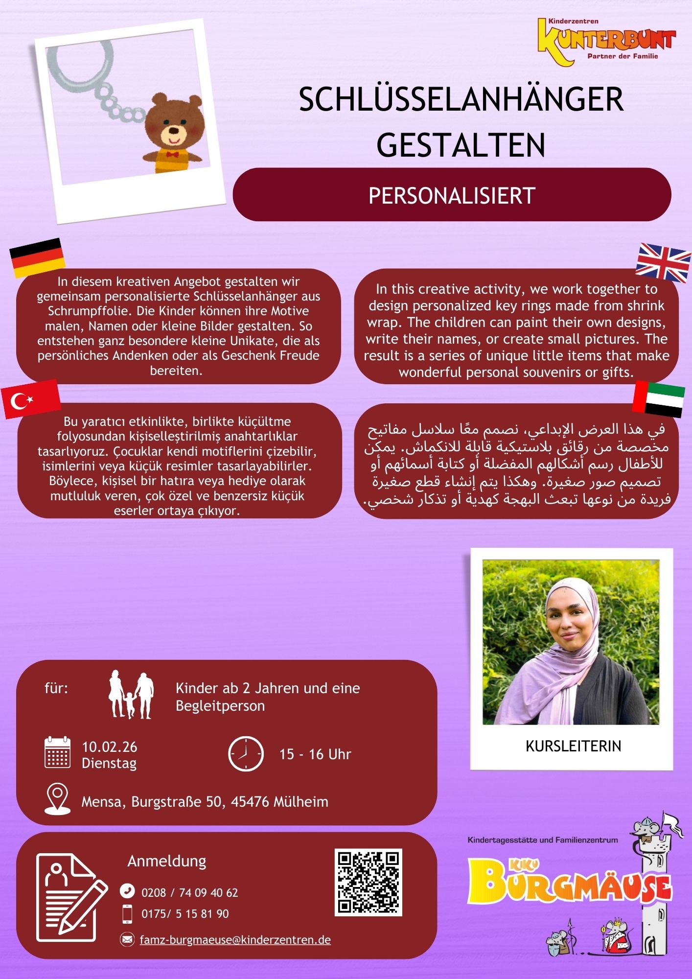 In diesem kreativen Angebot gestalten wir gemeinsam personalisierte Schlüsselanhänger aus Schrumpffolie. Die Kinder konnen ihre Motive malen, Namen oder kleine Bilder gestalten. So entstehen ganz besondere kleine Unikate, die als persönliches Andenken oder als Geschenk Freude bereiten.