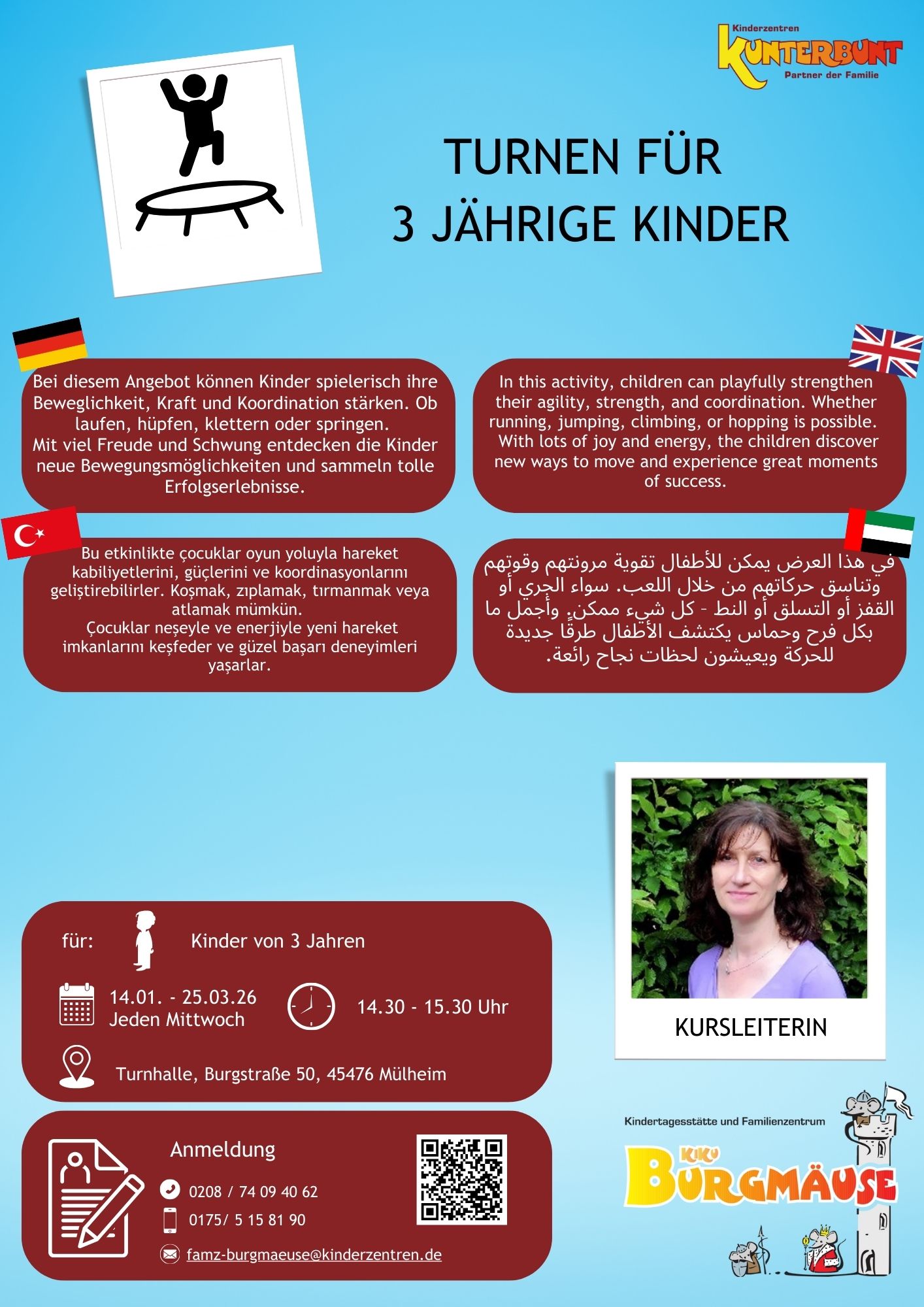 Bei diesem Angebot können Kinder spielerisch ihre Beweglichkeit, Kraft und Koordination stärken. Ob laufen, hupfen, klettern oder springen. Mit viel Freude und Schwung entdecken die Kinder neue Bewegungsmöglichkeiten und sammeln tolle