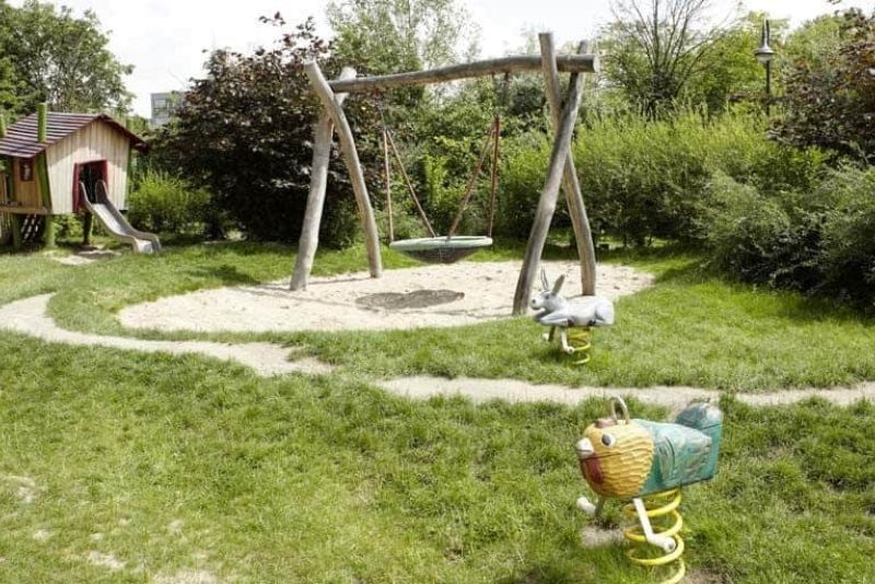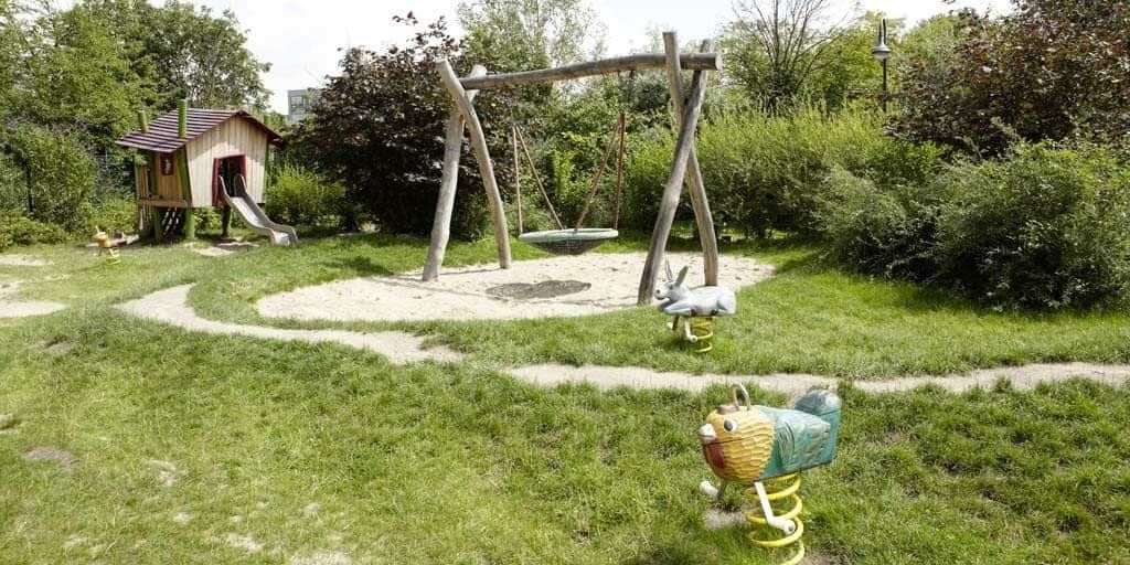 Dank unseres großen, grünen Außengeländes mit eigenem Gemüse- und Kräutergarten sowie vielen Kletter-, Schaukel- und Rutschgeräten verfügen die Kinder über einen eigenen Abenteuerspielplatz.