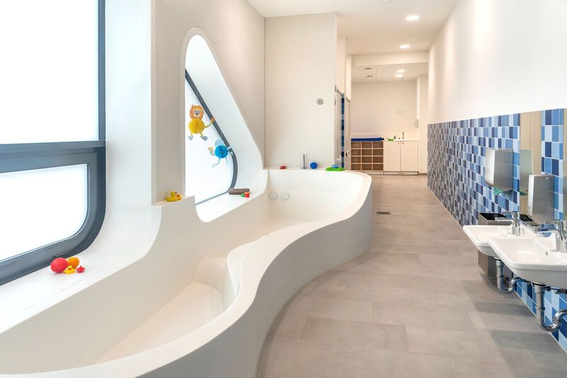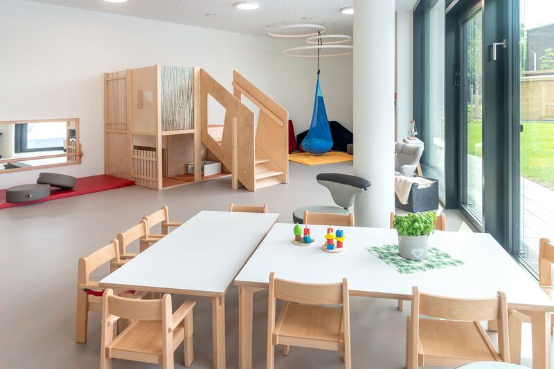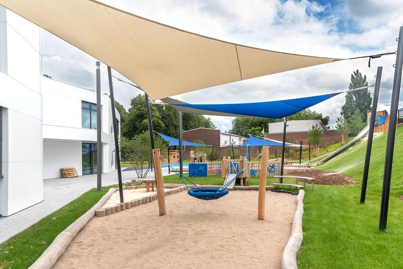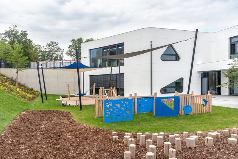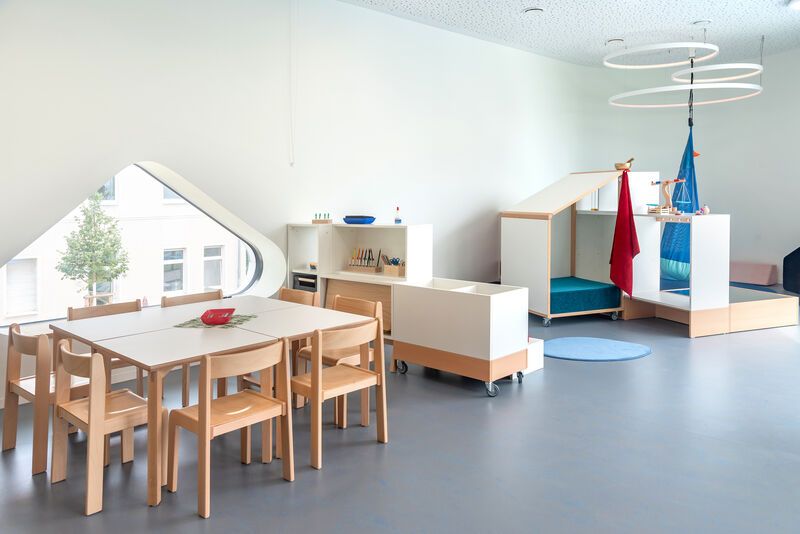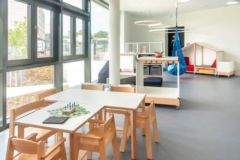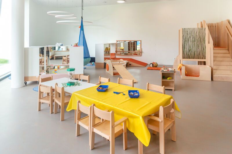Unsere Kita verfügt über ein sehr großzügiges Außengelände mit modernen U3- und Ü3-Bereichen, die den Kindern viel Raum zum Spielen und Entdecken bieten. Unsere modern ausgestattete Betriebskita verfügt außerdem über ein Medienlabor, eine geräumige Turnhalle, ein Atelier und vielfältige Bildungsräume, die kreatives Spielen, musische Aktivitäten, Bewegung und Entdecken unterstützen.