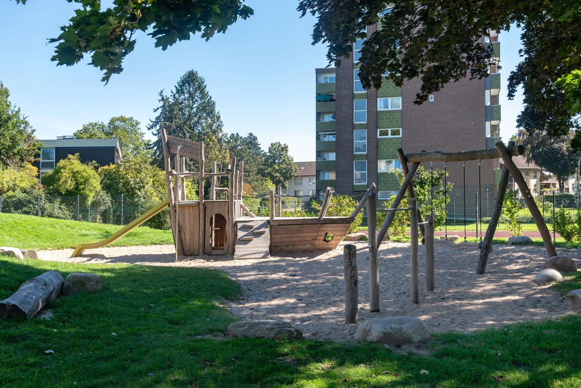 Das weitläufige Außengelände unserer Kita mit großem Klettergerüst in Holzschiff-Form, Schaukel, Matschanlage und insgesamt drei großen Sandkästen bietet Kindern verschiedenen Alters gezielte Bewegungsmöglichkeiten und fördert ihre Entwicklung durch altersgemäße Spiel-, Bewegungs- und Lernangebote in einem sicheren Umfeld.
