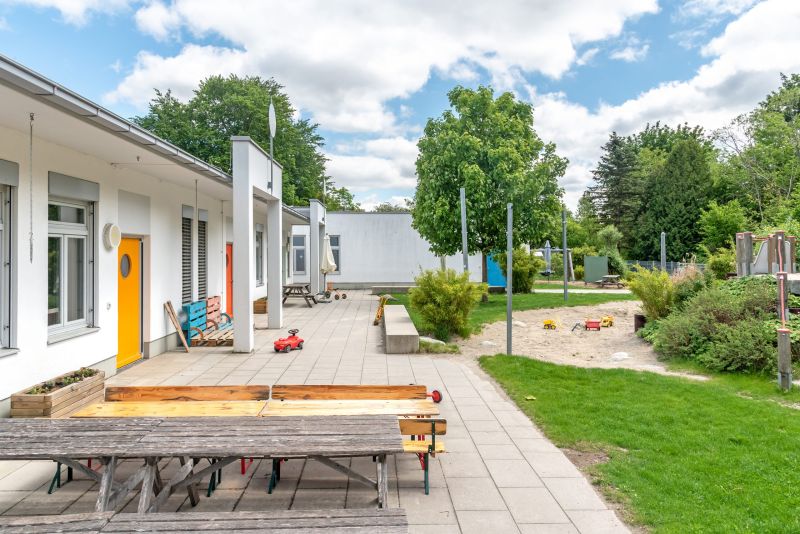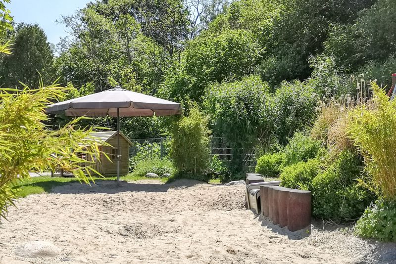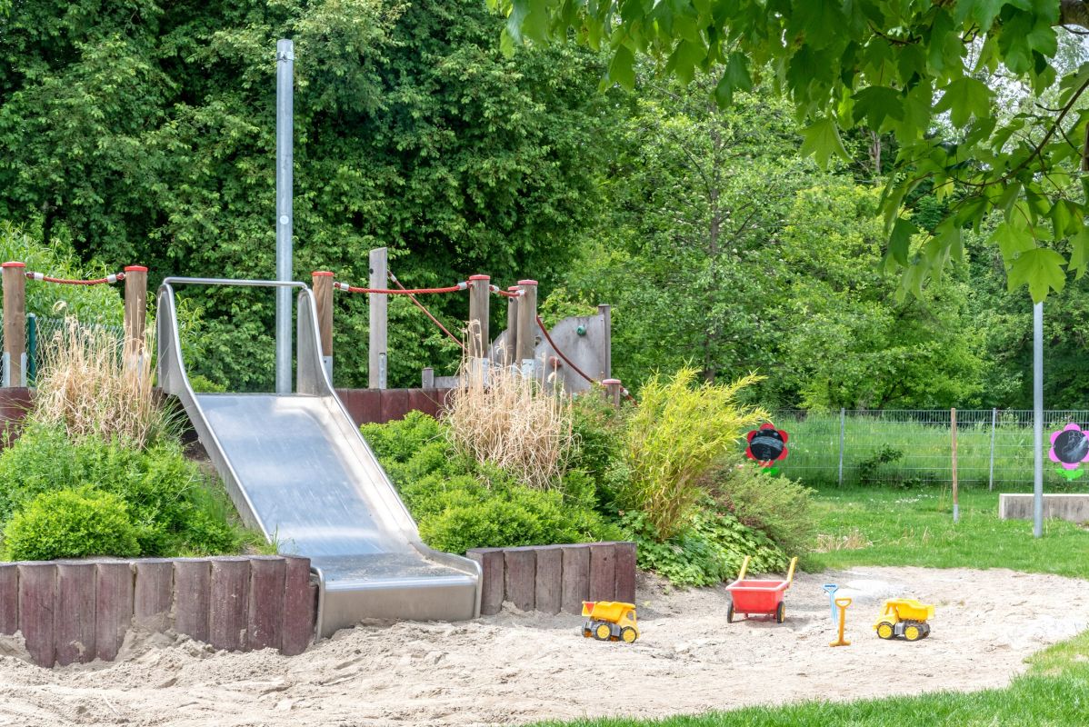 Der großzügige Außenbereich unserer Kita bietet Kindern verschiedenen Alters gezielte Bewegungsmöglichkeiten und fördert ihre Entwicklung durch altersgemäße Spiel-, Bewegungs- und Lernangebote in einem sicheren Umfeld. Durch ein Biotop und den Wald in unmittelbarer Nähe ermöglichen wir den Kindern Ausflüge mit nachhaltigen Naturerlebnissen.