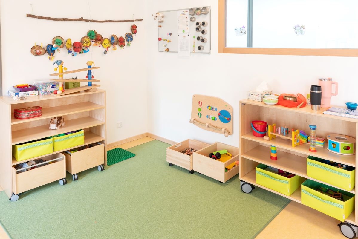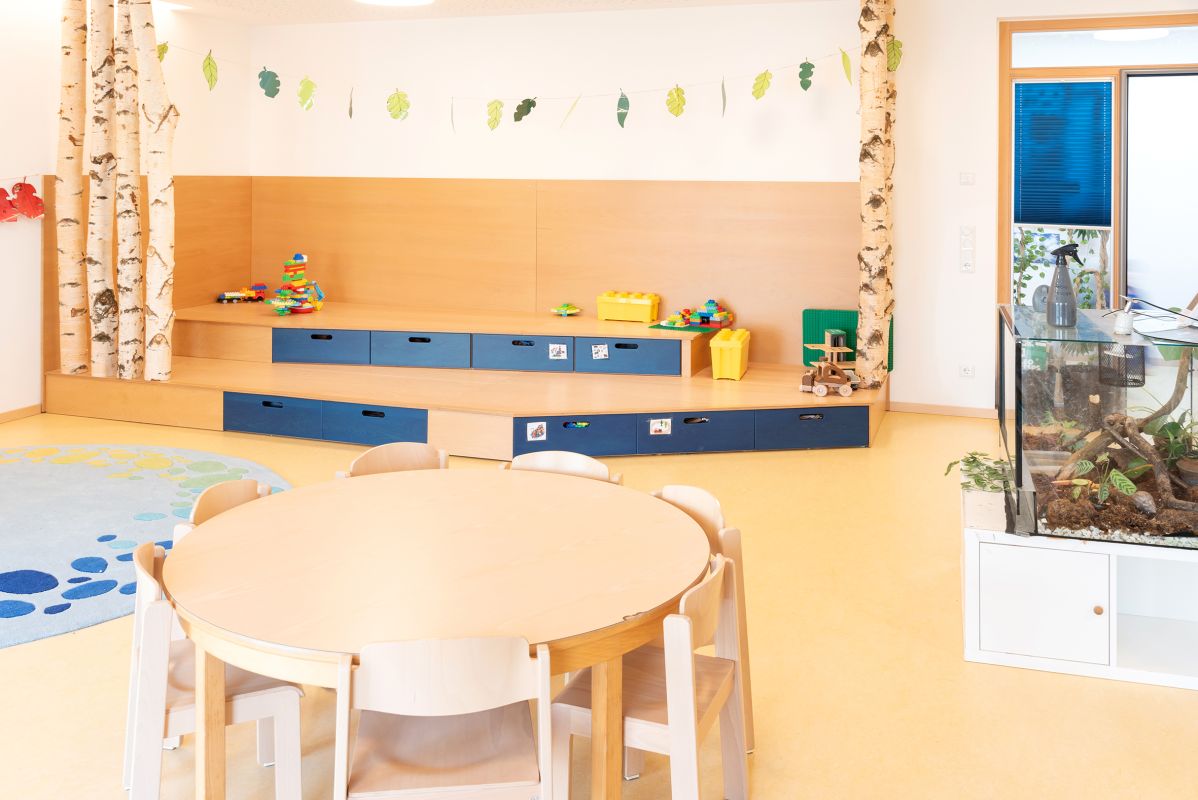 In unserem schönen Neubau mit hellen Räumlichkeiten dürfen die Kinder nach dem morgendlichen Ankommen in der Gruppe ihren Interessen dank unseres teiloffenen Konzepts in verschiedenen Lern-, Kreativ- und Spielbereichen nachgehen.